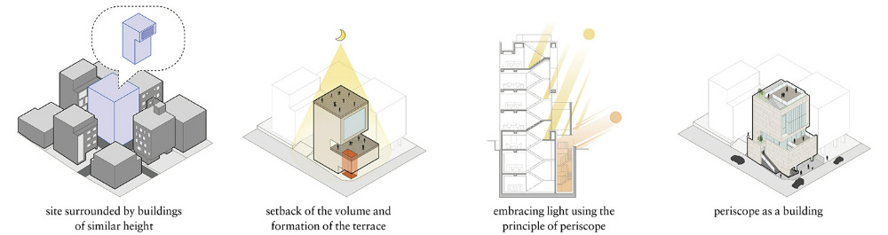 “We applied the periscope principle as an architectural device to draw light and views into the building, even within an extremely constrained urban environment.”