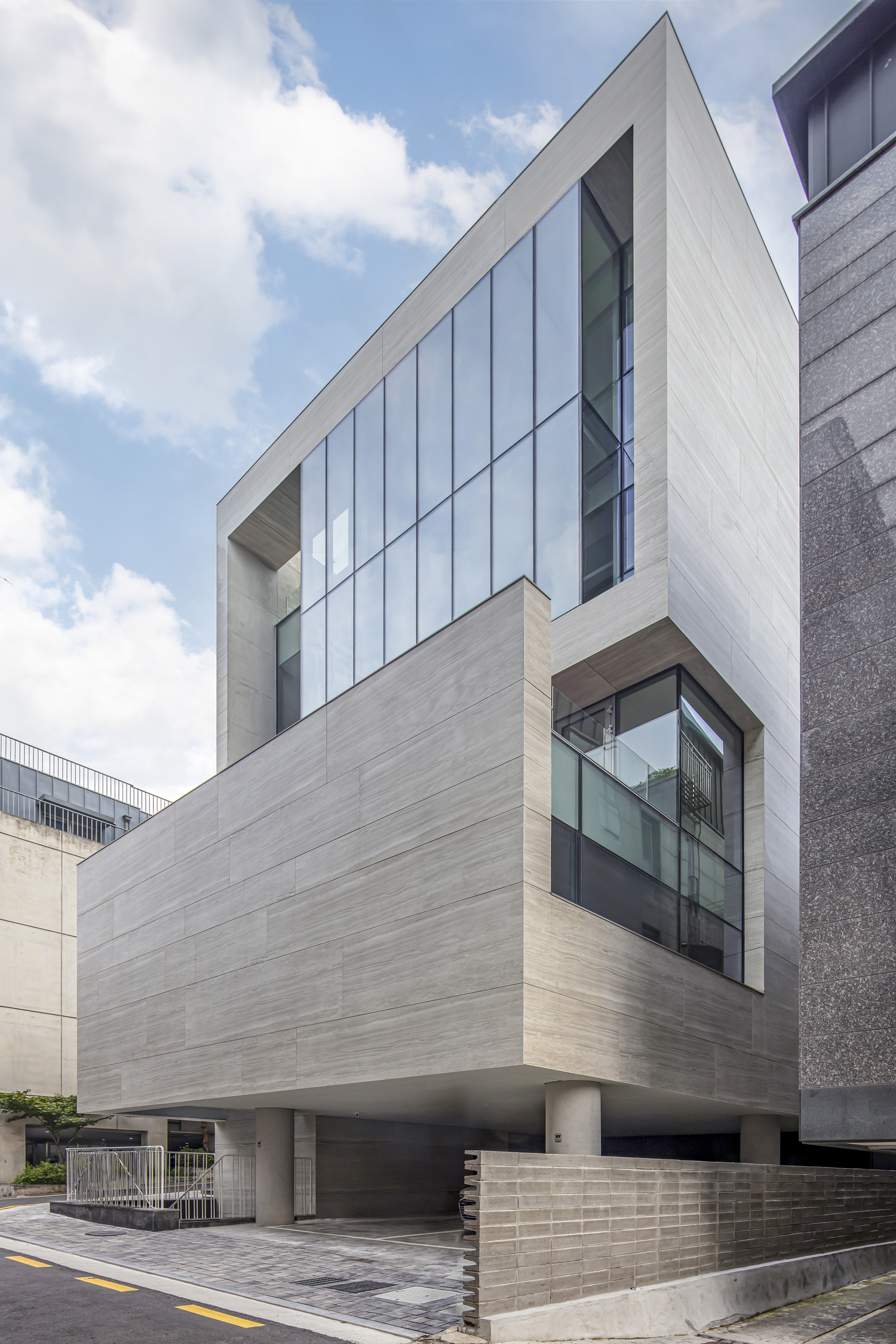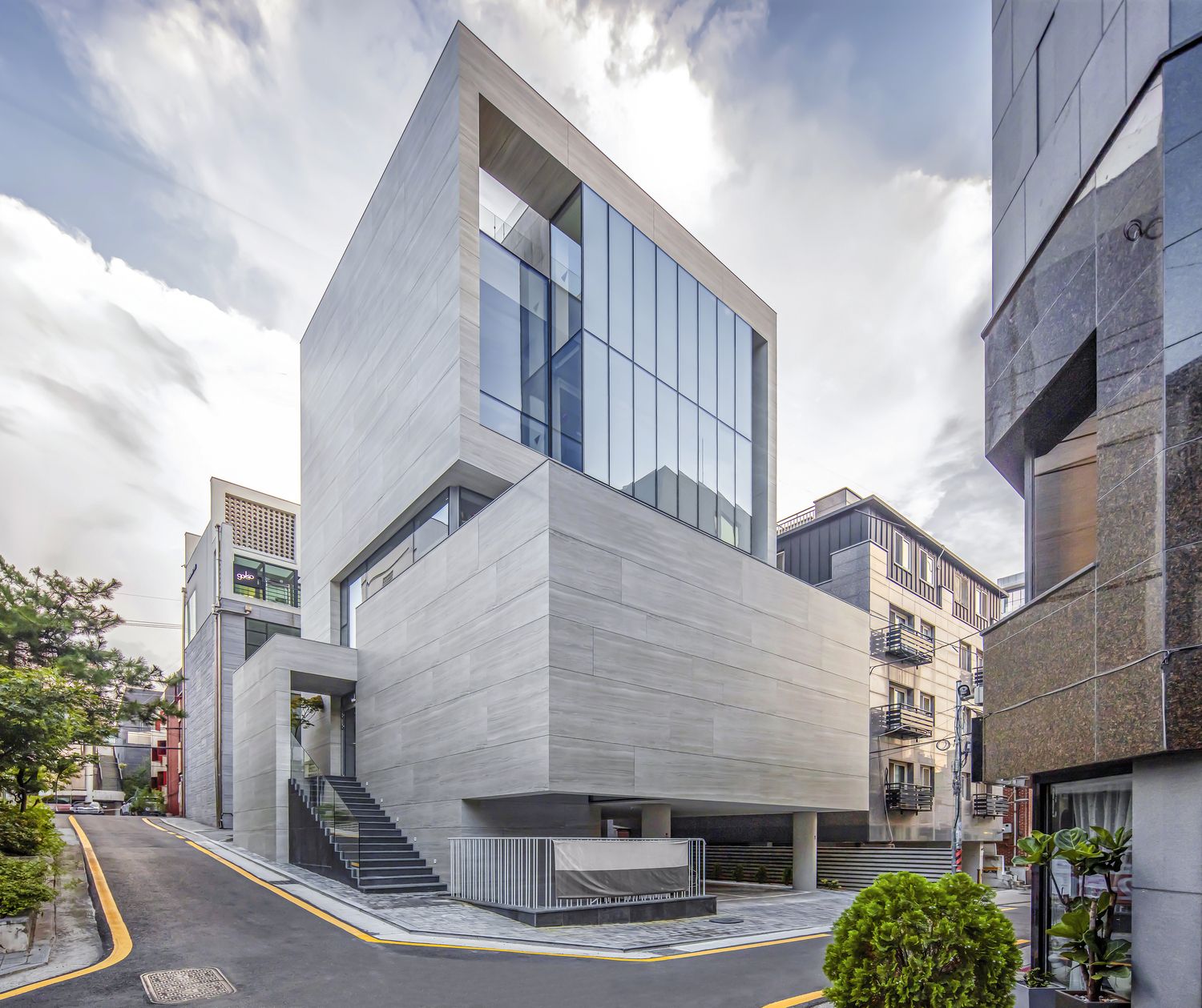 Nonhyeon Periscope is a public building for everyday use located in the Gangnam district, one of the most densely developed and consolidated urban areas in Seoul. Designed by L’EAU Design Studio and developed in collaboration with GAI International, it stands on a 195 m² plot in a narrow alley in Nonhyeon-dong, with a gentle slope and surrounded by buildings of similar height.