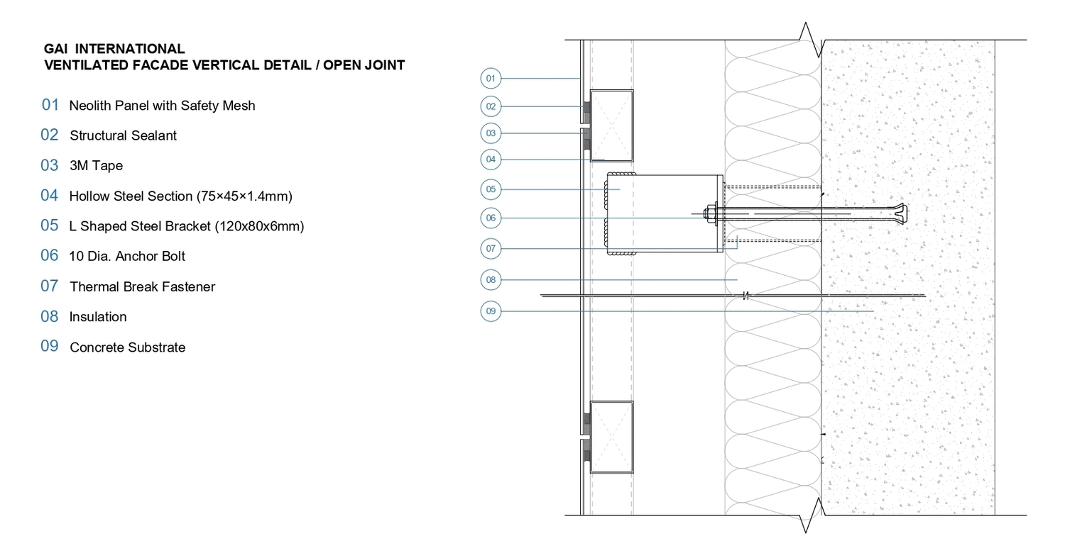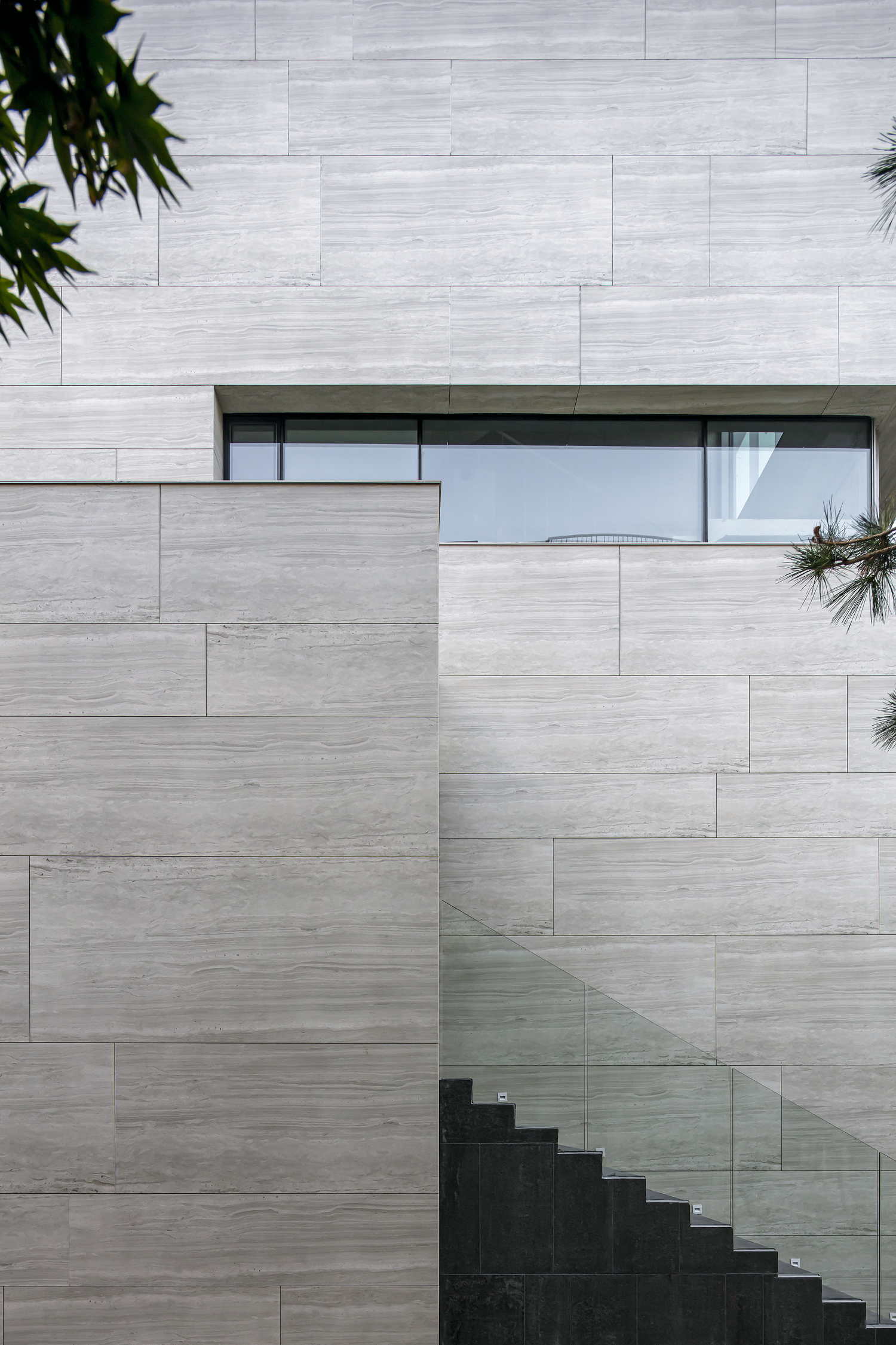 The building’s facade plays a key role in establishing a unified architectural expression. It is clad with Neolith Strata Argentum panels in a Riverwashed finish, installed using a ventilated facade system developed by GAI International.