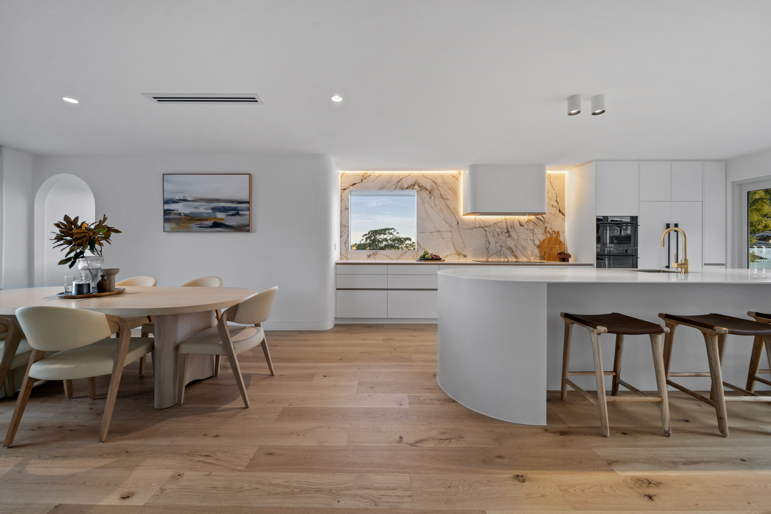 The design took shape around a set of clear principles: timeless, soft curves; a neutral palette with the signature warmth of timber; coastal inspiration; and an optimized layout made to fully enjoy life at home. The residence needed to respond naturally to a wide range of moments—from quick family breakfasts to entertaining guests—without losing order, flow, or visual clarity.