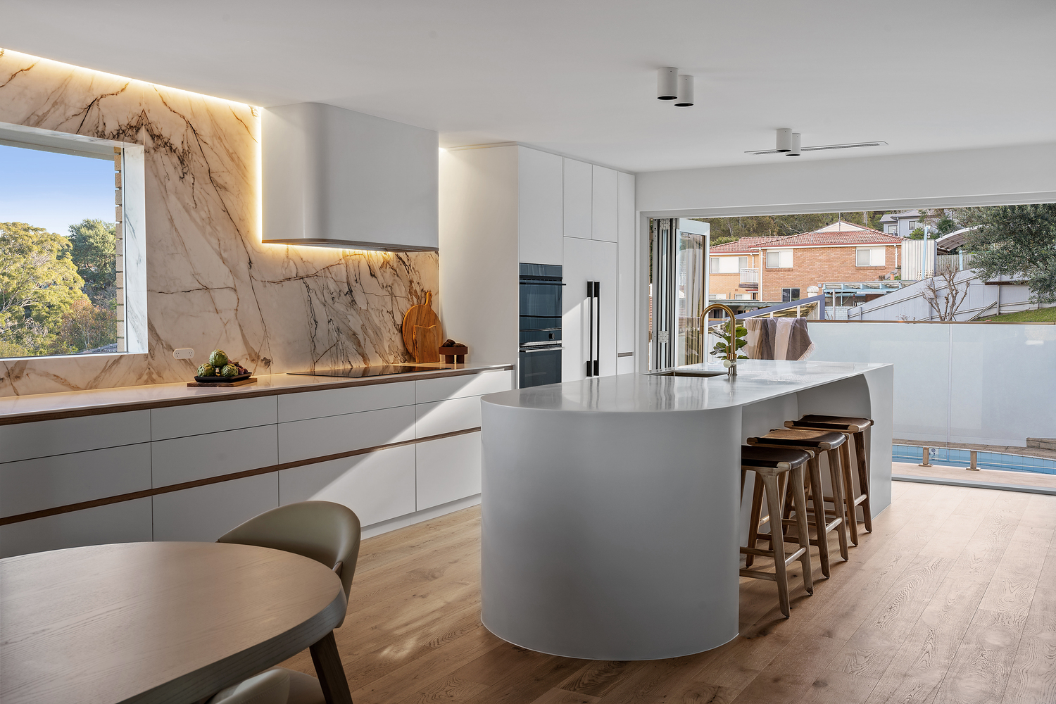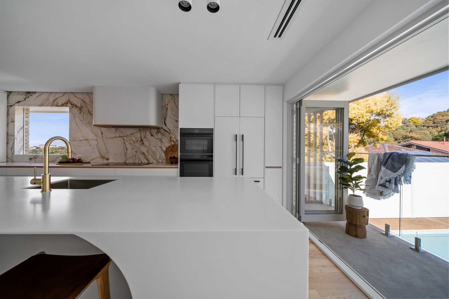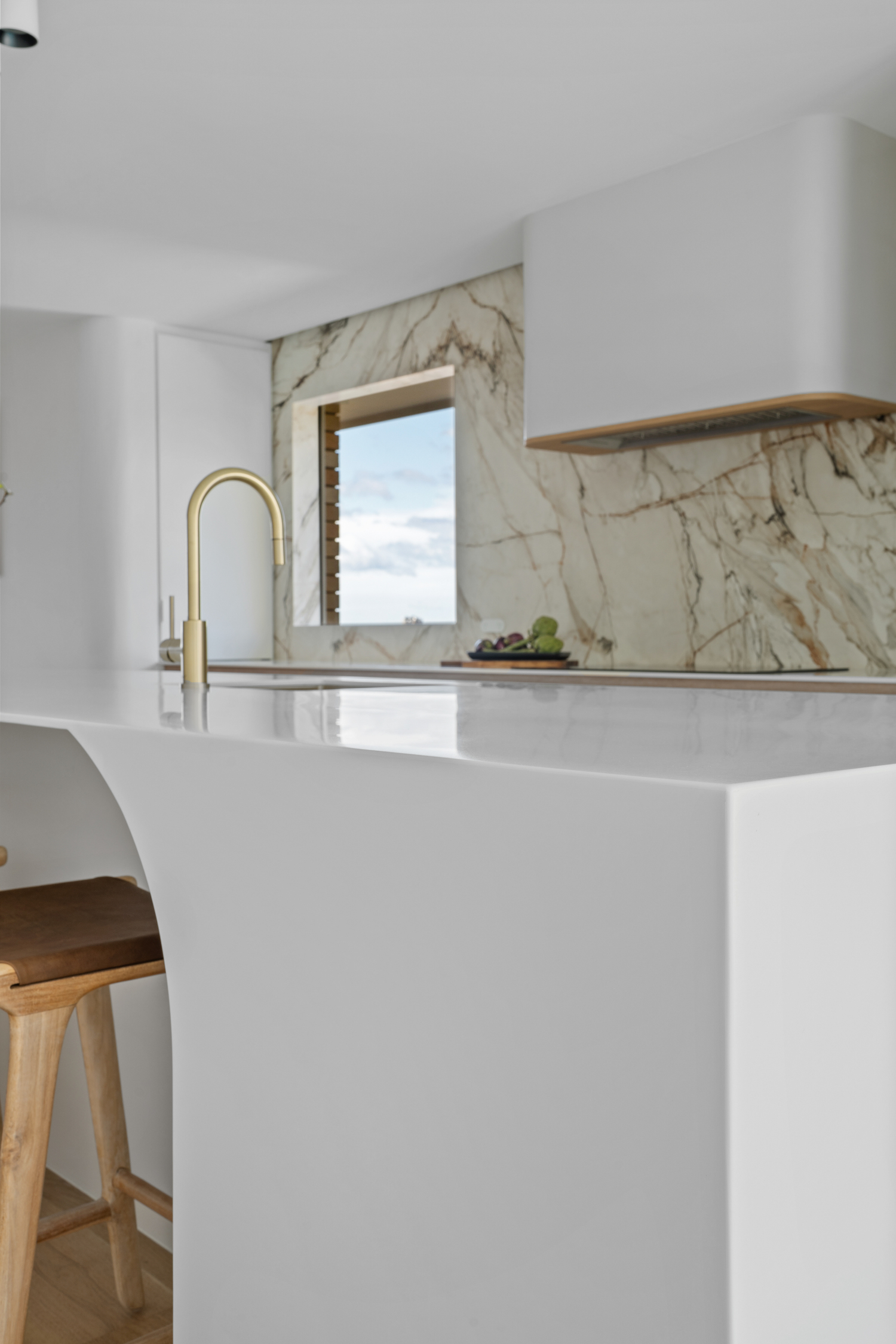 To bring the island’s organic forms—and the main volumes—to life, Corian was specified across the benchtop surfaces, island, and rangehood box, taking advantage of its versatility and its ability to be curved and thermo-formed. This choice enables a fluid, continuous geometry without visual interruptions, reinforced by a white finish that keeps the focus on the design innovation and the island’s curved profile.