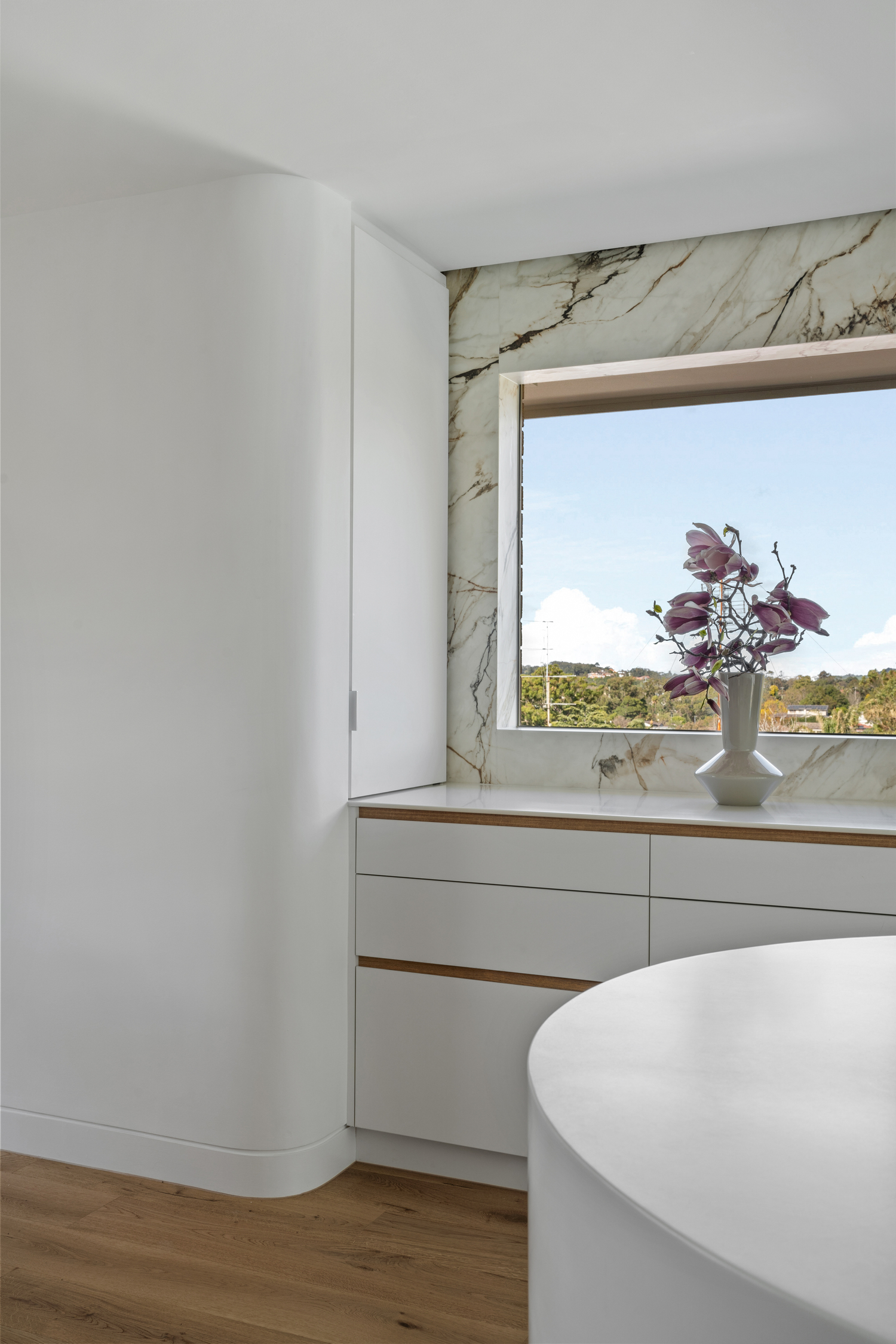 Material consistency extends across the entire residence. The home is built on a base of crisp whites and natural oak timber highlights, with selected feature stone elements chosen to bring continuity and sophistication. The joinery incorporates Fenix nano-technology, selected for its contemporary finish and its suitability for everyday, high-traffic living.