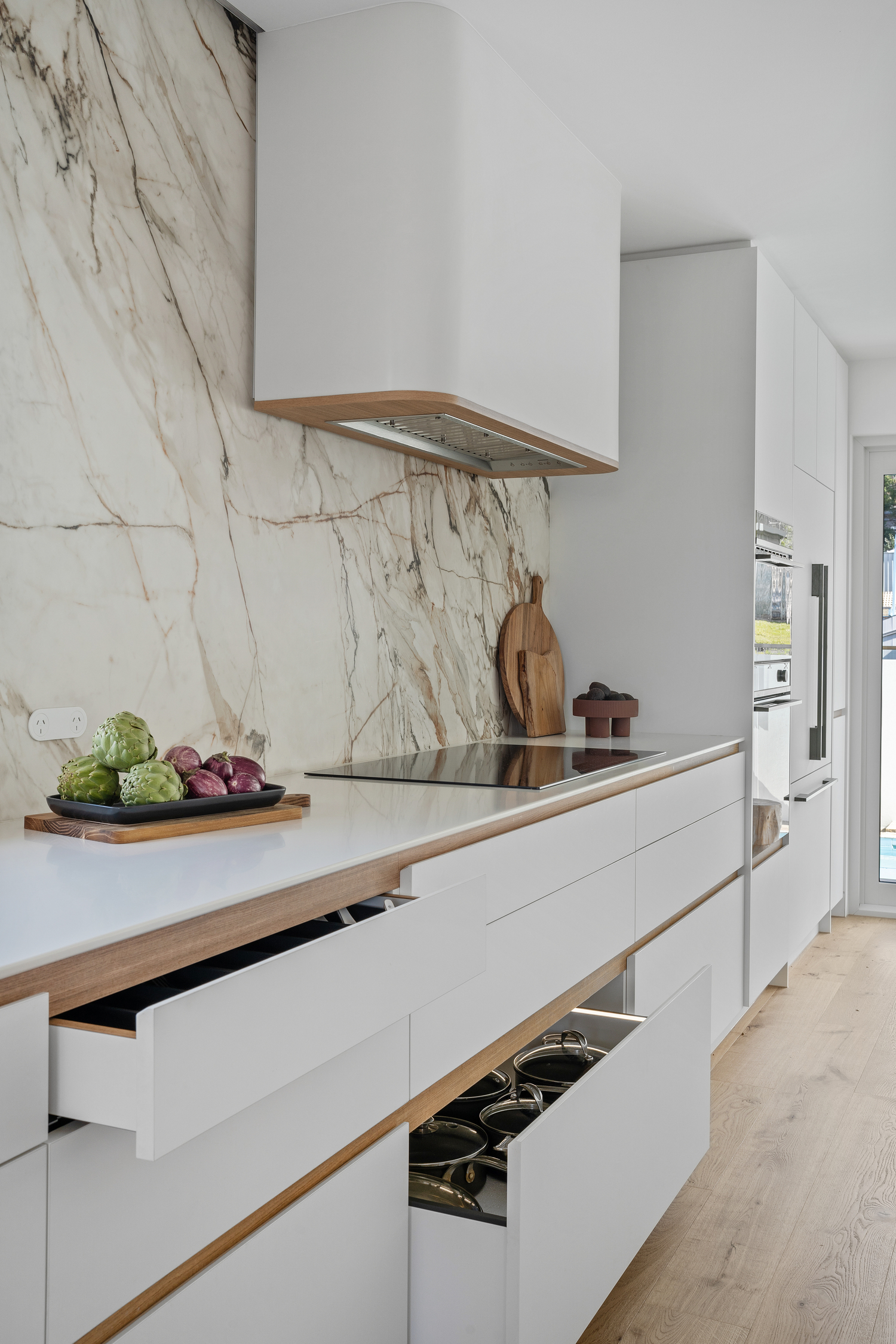 Functionality received the same level of attention as aesthetics. The kitchen incorporates a hidden appliance cupboard with a Hawa Concepta pocket door system, designed to keep the benchtop clear when the space is not in use. Inside, a slide-out coffee shelf supports daily routines and adds convenience while preserving the kitchen’s clean visual language.