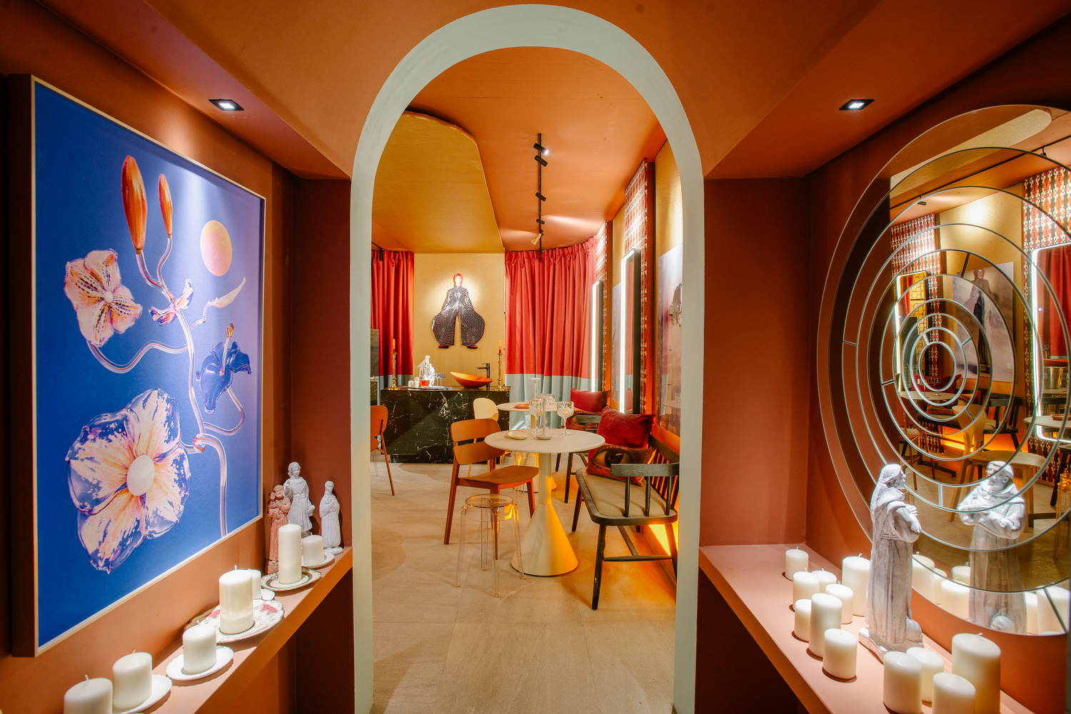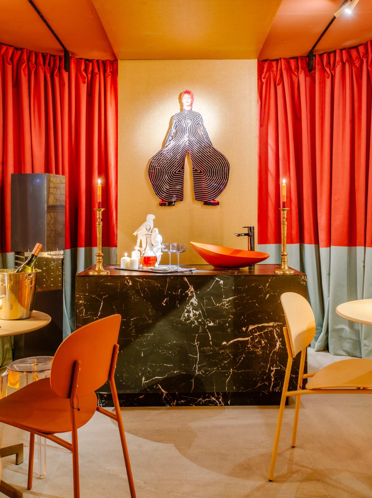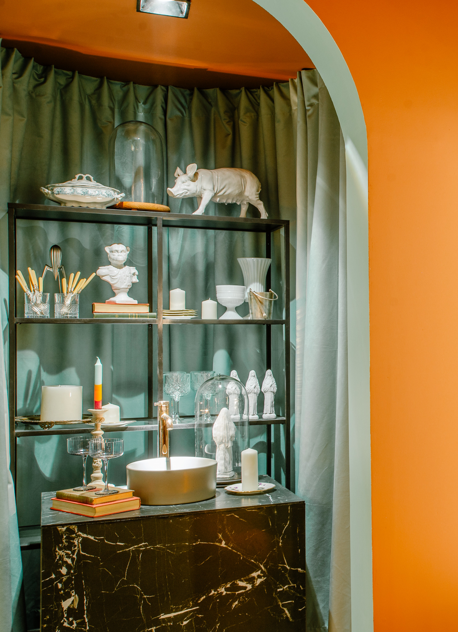 Used on both the bar tops and in the washbasin area, Neolith Niagara unifies the space and supports the chromatic drama, balancing the interplay of golds, terracottas, and blues.