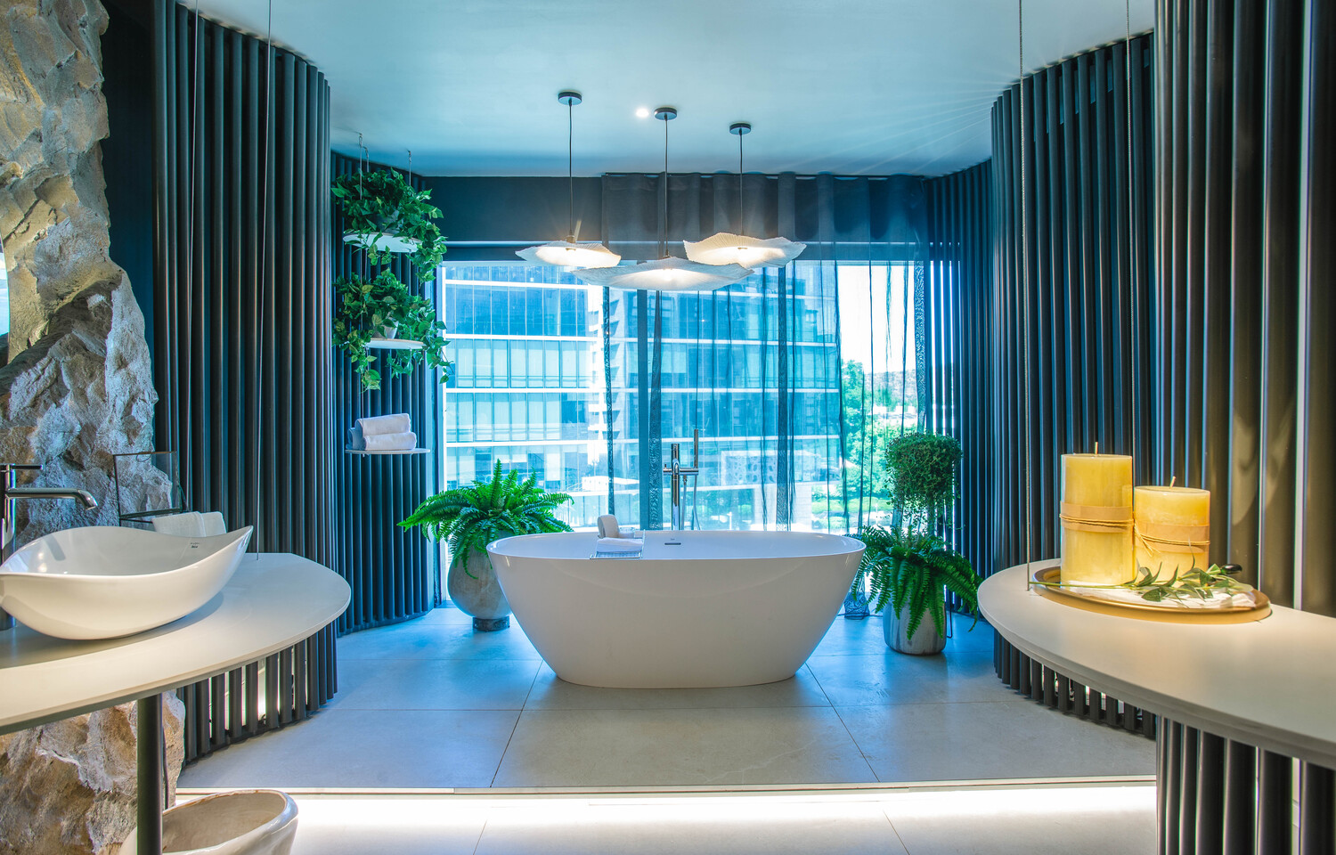 In “Sala de Baño by Roca”, designer Carlos Gallardo of CG Interiorismo + Arquitectura reinterprets Mediterranean ambience through a palette of beige, black accents, and materials that evoke stone, sand, and light wood. A vaulted ceiling culminates in a half-moon window that lets in natural light and enhances the relief and volumes.