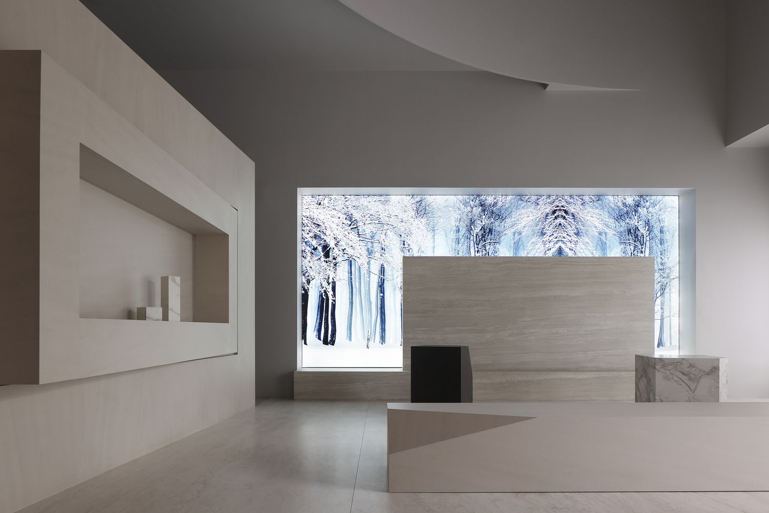 Inside, simplicity continues. Superfluous ornamentation is stripped away, letting Neolith sintered stone take center stage. Playful sculptural arrangements of stone, reminiscent of rocks scattered in nature, bring a sense of effortless spontaneity. This makes the gallery an ideal setting for intimate gatherings, where people can sit, lean, and converse in an atmosphere of ease and openness.