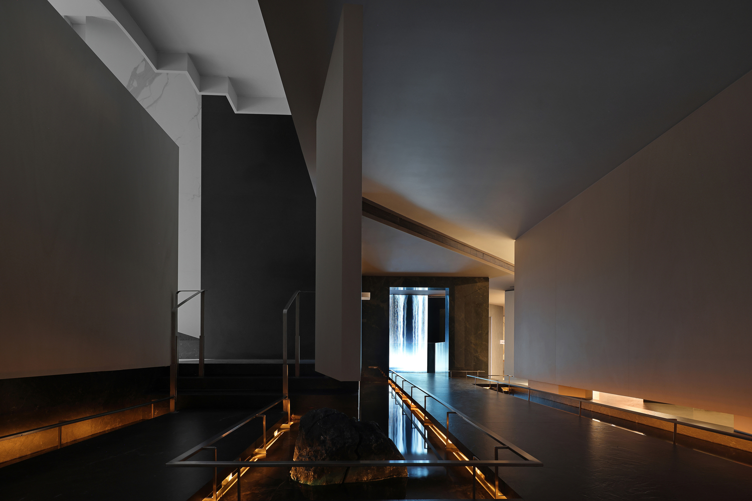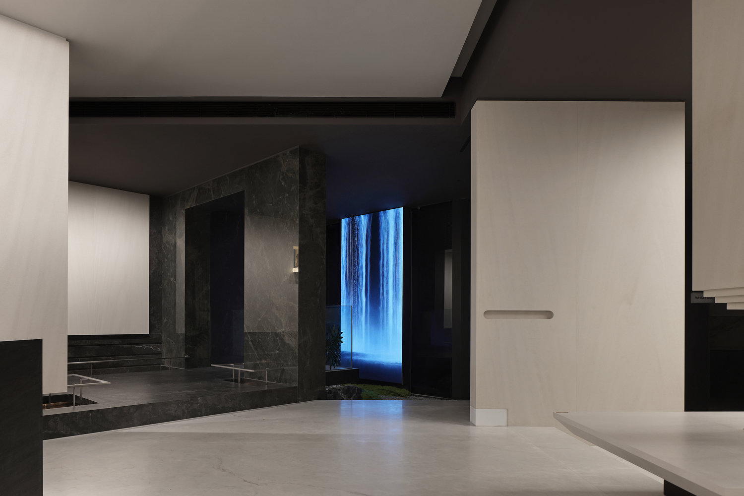 Hidden light sources trace along a water-feature corridor, where the dark intensity of Neolith Layla contrasts with the calm tones of Neolith Arena, creating a serene and immersive environment. At the corridor’s end, a bespoke LED wall reflects natural water patterns, enhanced by textured flooring that resembles rock weathered by flowing streams. Visitors are drawn into a sensory experience where stone, water, and light converge.