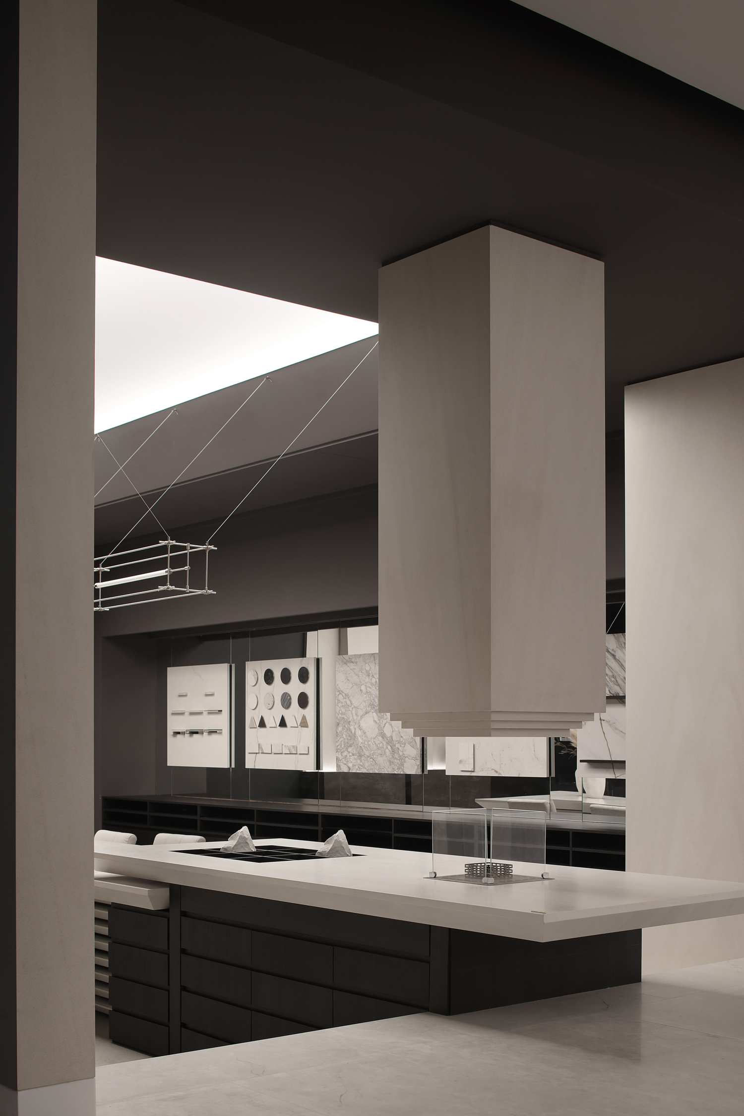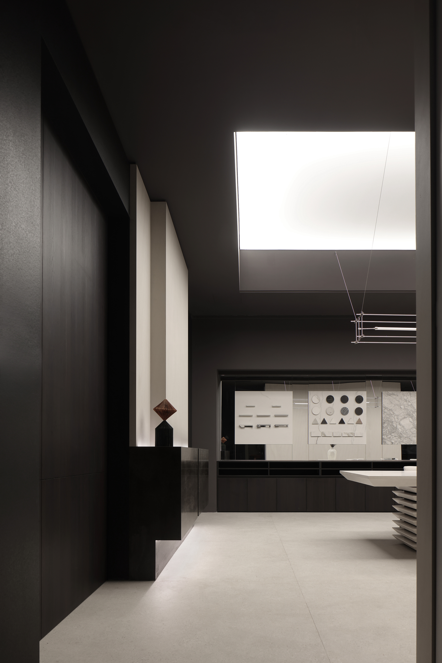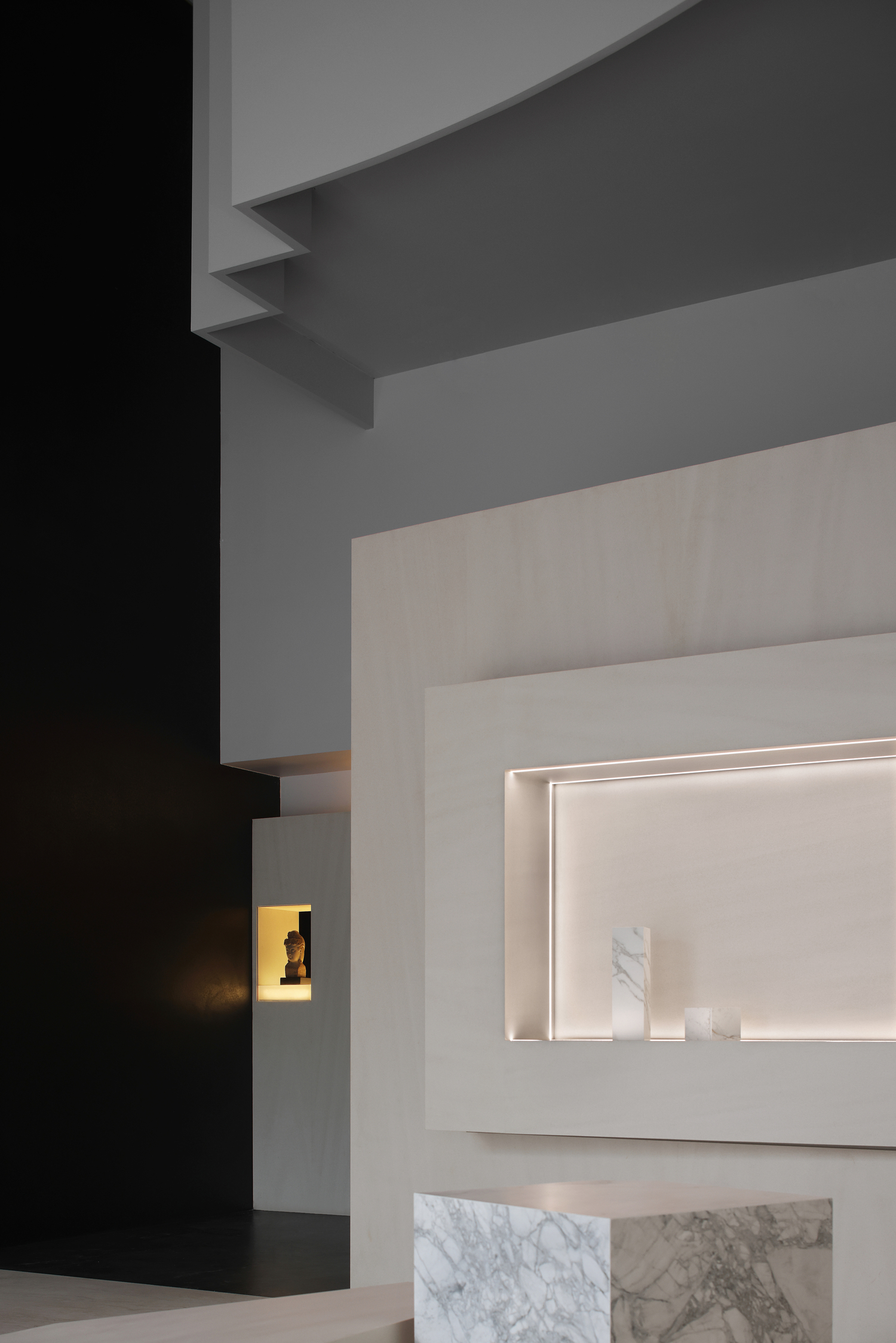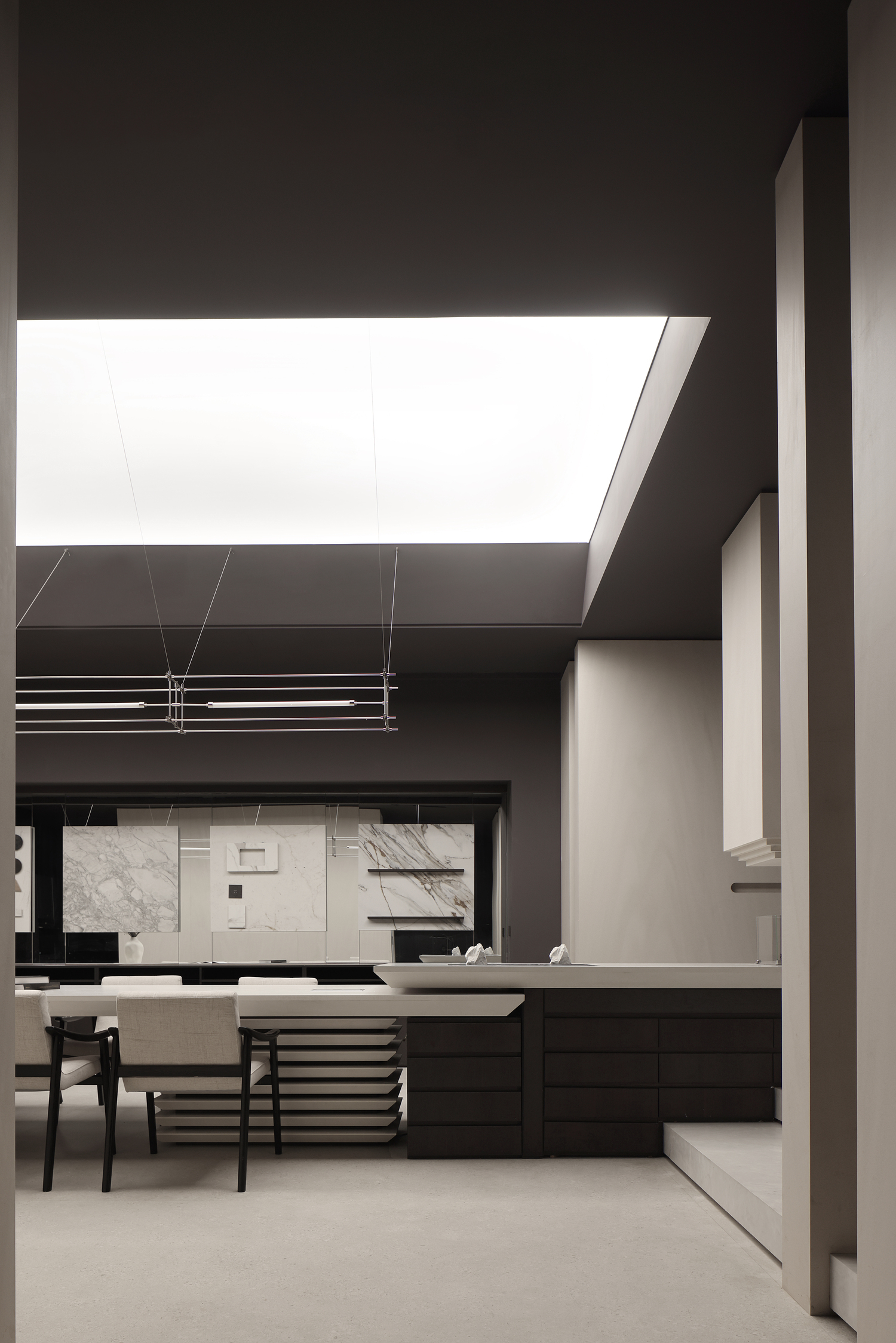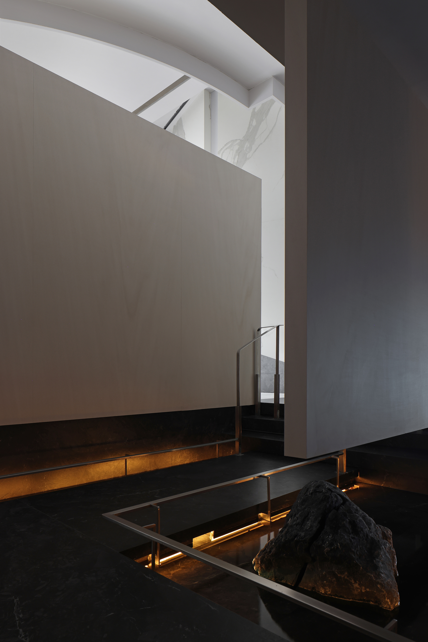 The designers used light as an architectural tool. Adjustable lighting reveals the delicate veins and unique surface qualities of each slab, enriching the atmosphere with depth and rhythm.