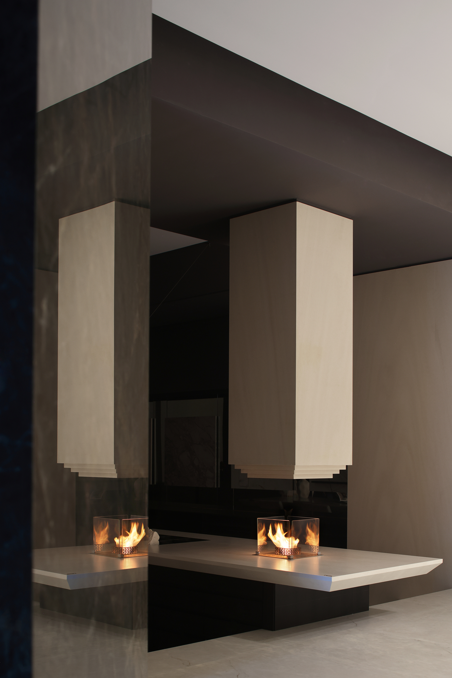 Inside, simplicity continues. Superfluous ornamentation is stripped away, letting Neolith sintered stone take center stage. Playful sculptural arrangements of stone, reminiscent of rocks scattered in nature, bring a sense of effortless spontaneity. This makes the gallery an ideal setting for intimate gatherings, where people can sit, lean, and converse in an atmosphere of ease and openness.
