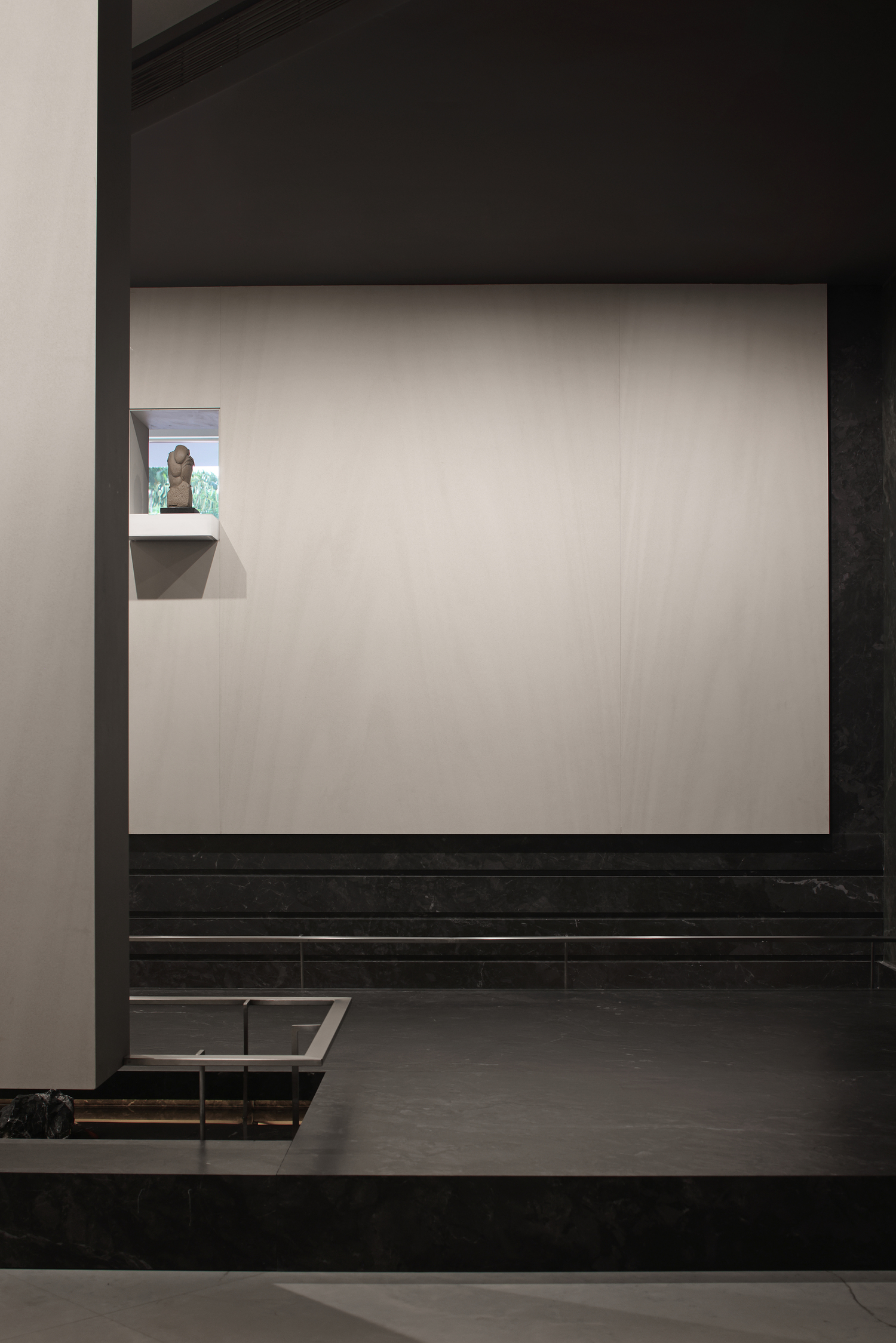 At the entrance, Neolith Estatuario is reinterpreted in a dynamic composition, guiding the visitor’s gaze and setting the tone for discovery. Further inside, soft beams highlight the sandy texture of Neolith Arena, while sculptures within niches gain a sculptural, almost mysterious presence.