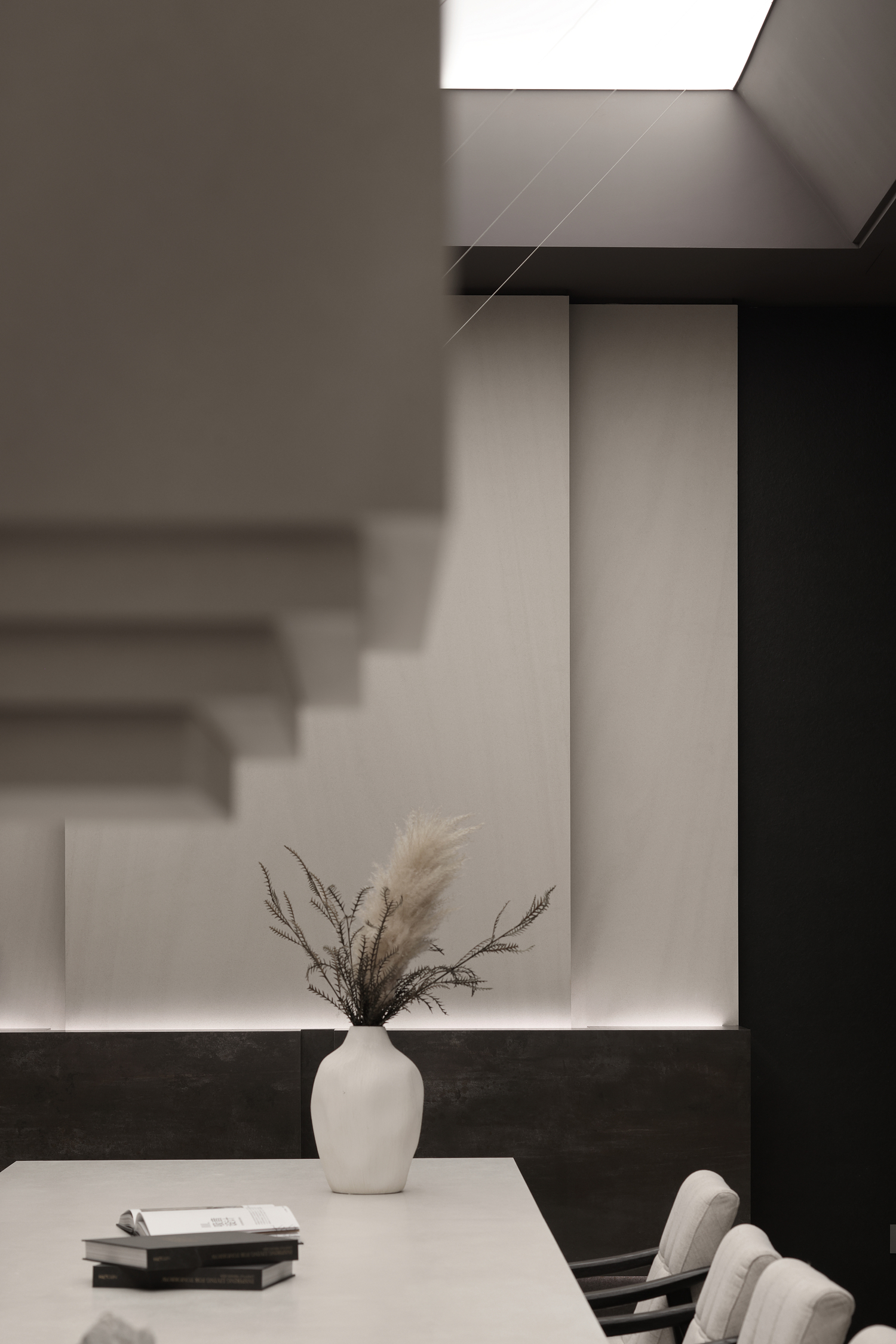 Even the fireplace base and table legs employ advanced techniques inspired by Italian architect Carlo Scarpa, layering surfaces to create rhythm and order. Every corner, from stair edges to wall junctions, achieves a flawless continuity that reflects both technical mastery and artistic refinement.