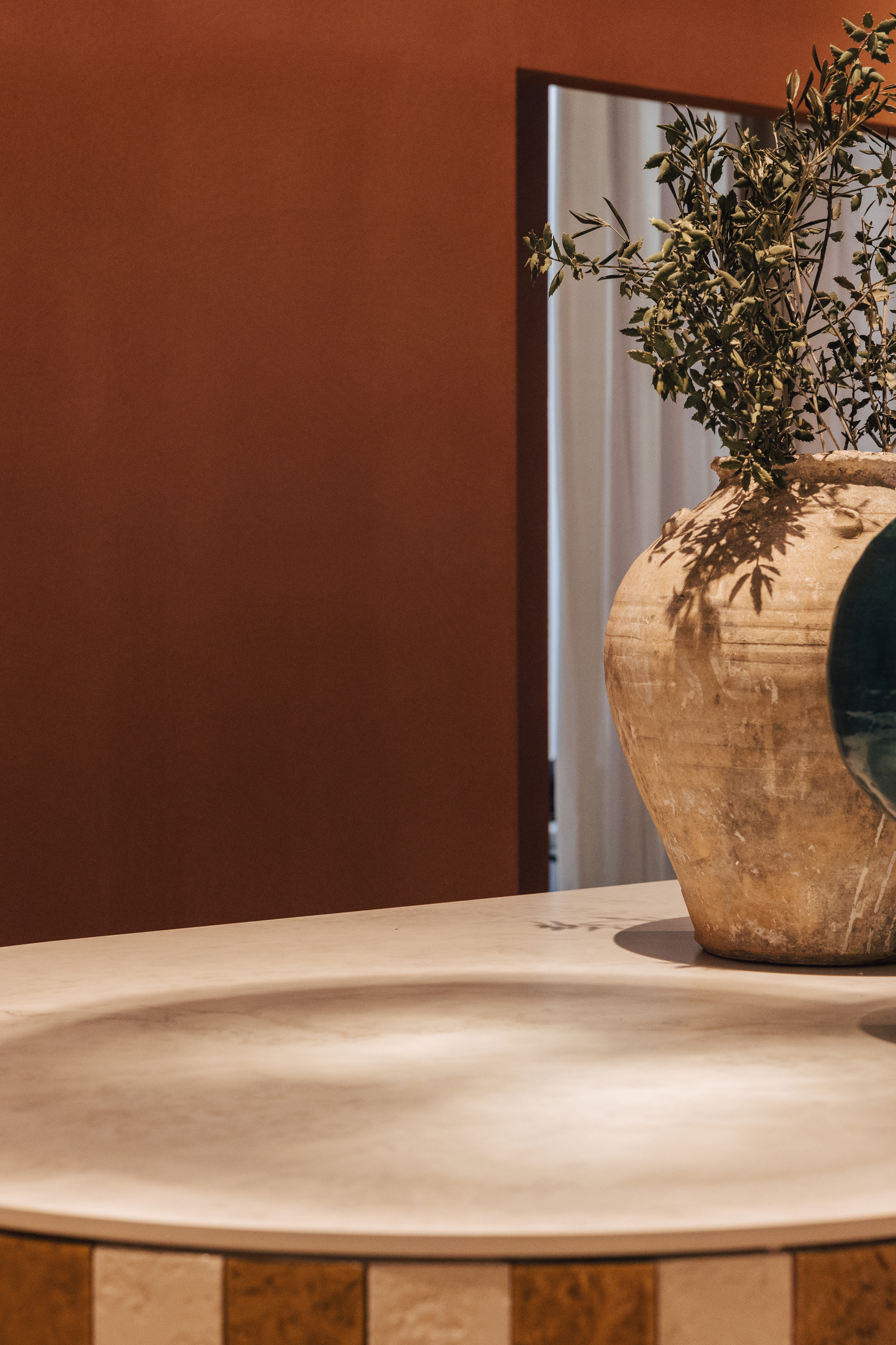 - Neolith participa con piezas centrales del espacio, como la encimera de la mesa y el banco, realizadas con los modelos Everest Sunrise y Rapolano.