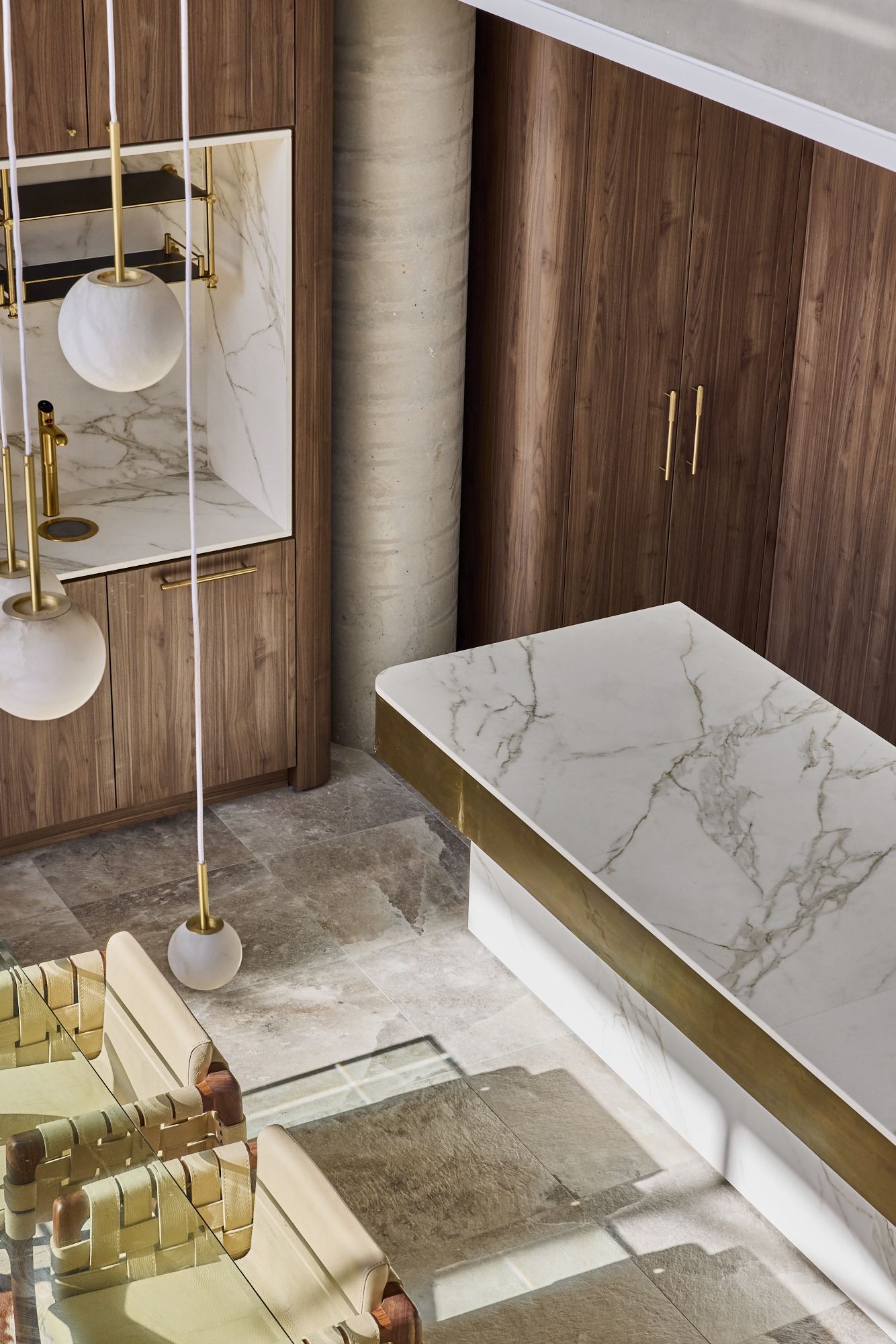 In the kitchen, the striking Neolith Calacatta takes center stage, adorning the main countertops, café nook, and butler’s pantry. The café nook elevates both form and function, with Neolith extending from the countertop to the backsplash, creating a seamless visual flow.