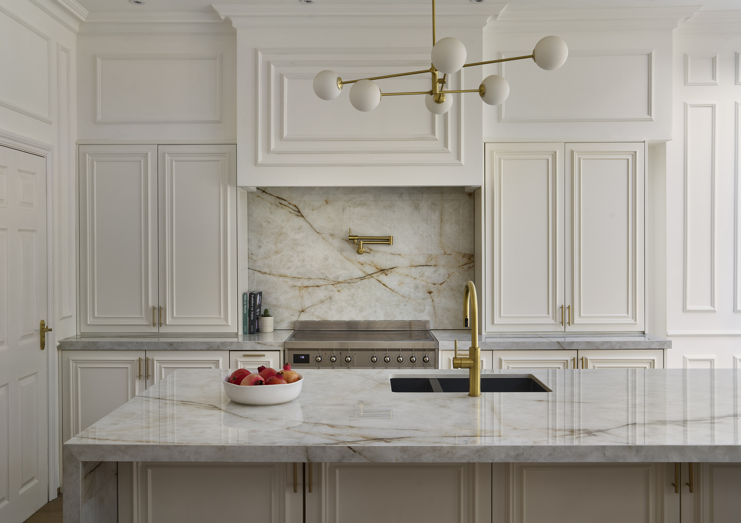 This sense of calm is reinforced through the room’s cohesive material language. Cream-toned classic joinery with panelled detailing brings quiet refinement, while brushed brass fixtures introduce warmth and contrast. Light oak timber flooring adds softness underfoot and natural continuity, complementing the stone’s warmer undertones. Overhead, modern brass pendants with opal glass globes echo the hardware, tying the palette together without disrupting the simplicity of the scheme.