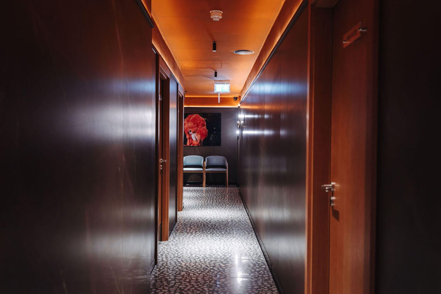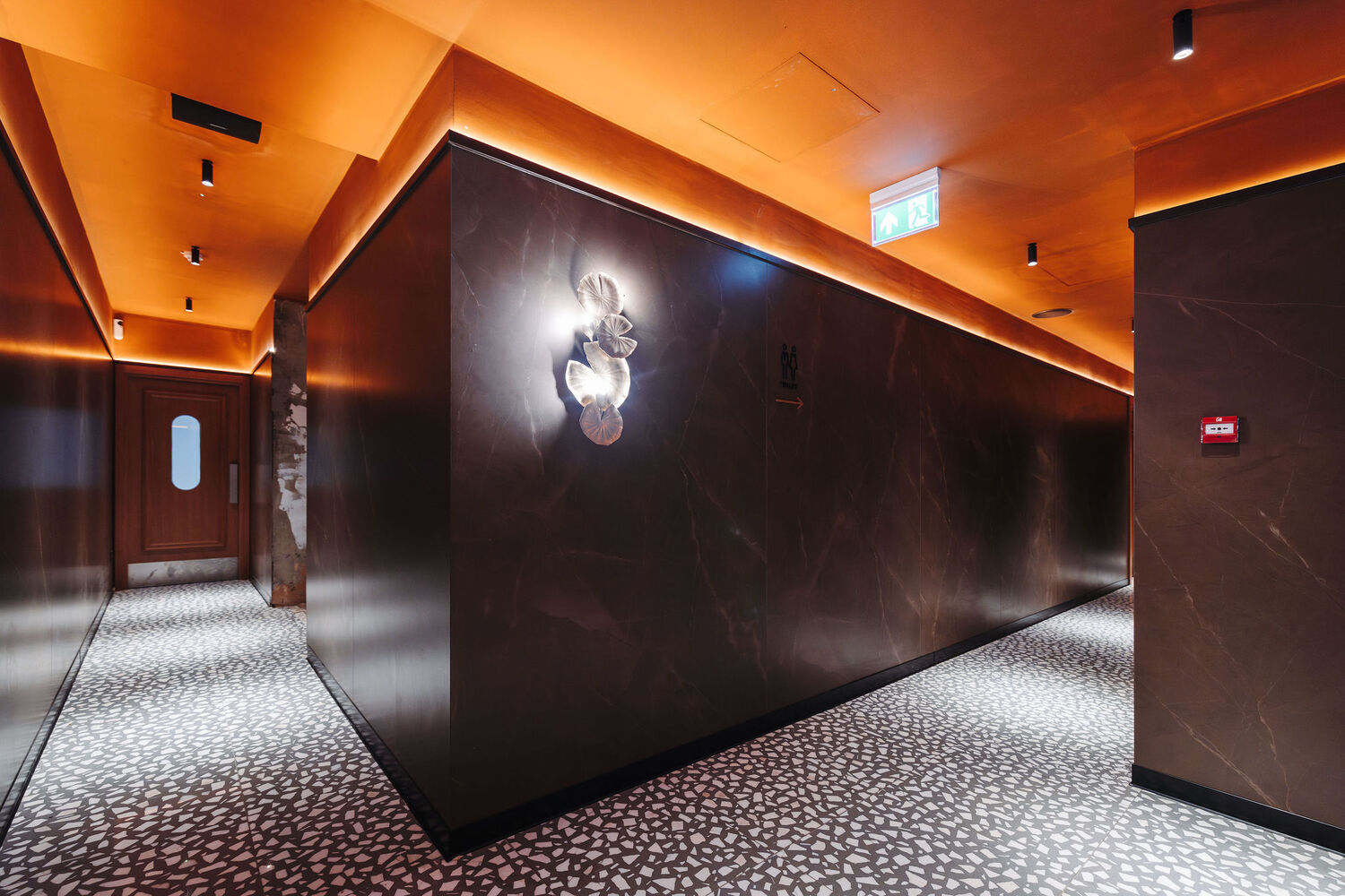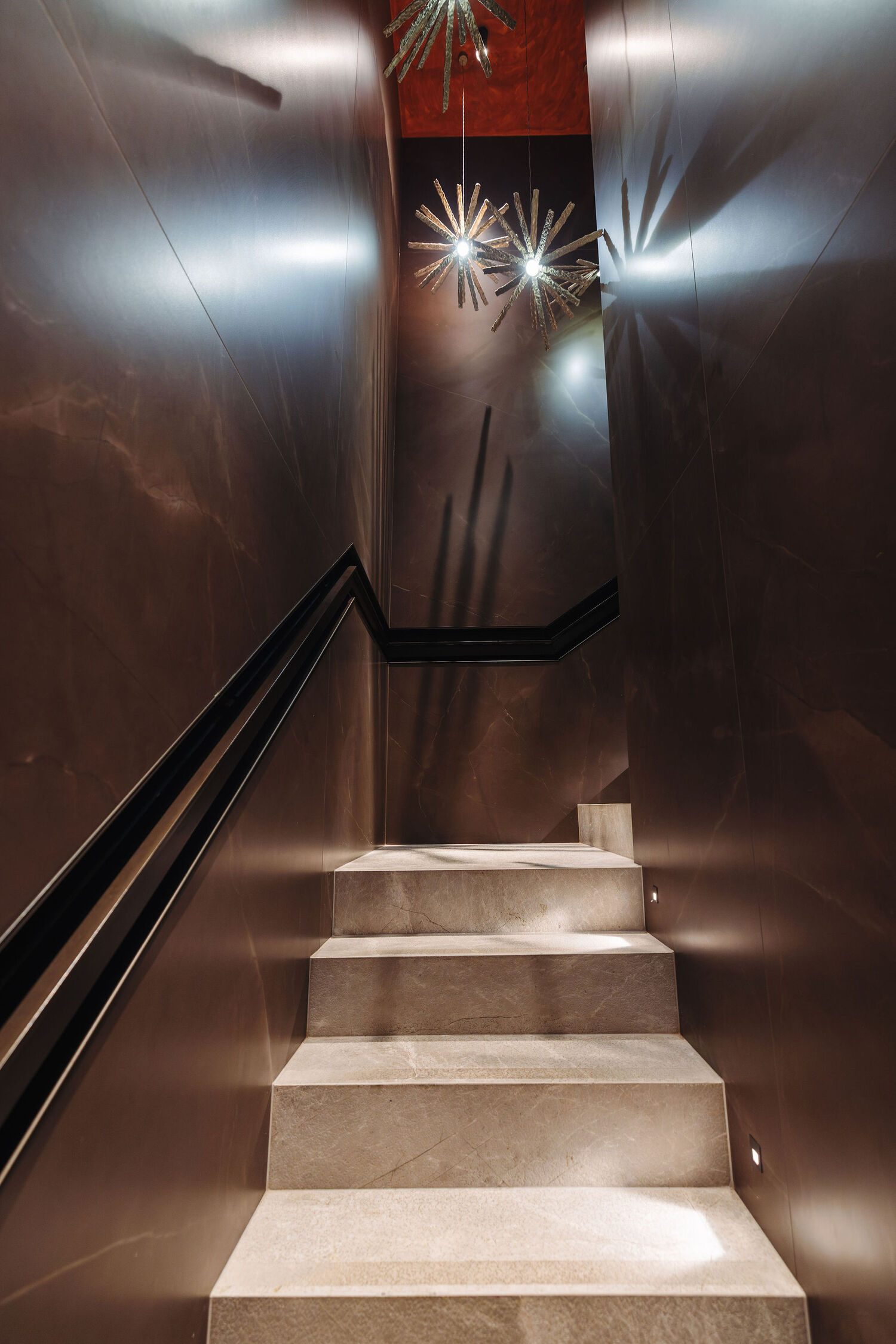 A focal point of the design is Neolith Pulpis, a sintered stone surface inspired by classic brown marble and celebrated for its warm veining and refined, earthy tones. Installed in a slim 6 mm thickness, Neolith Pulpis is used extensively on vertical surfaces—including the stairwells and ground floor walls—to deliver visual continuity and understated luxury. The design team embraced large-format pieces to minimize joints and heighten immersion. The slender thickness integrates seamlessly on the wall without adding structural bulk, a practical advantage in high-traffic environments.